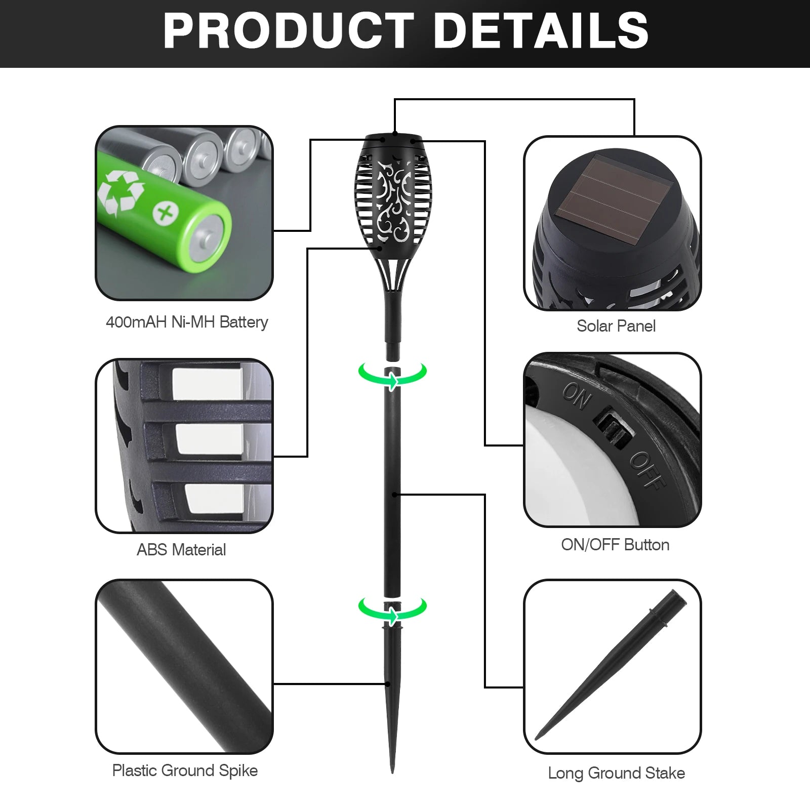 【Auto ON OFF】The solar torch light is light-controlled sensor to realize the auto on off dusk and dawn, creating a gorgeous and charming campfire atmosphere. Simply stake the lights into the ground in a sunny location, and they will automatically illuminate your outdoor space when the sun sets.