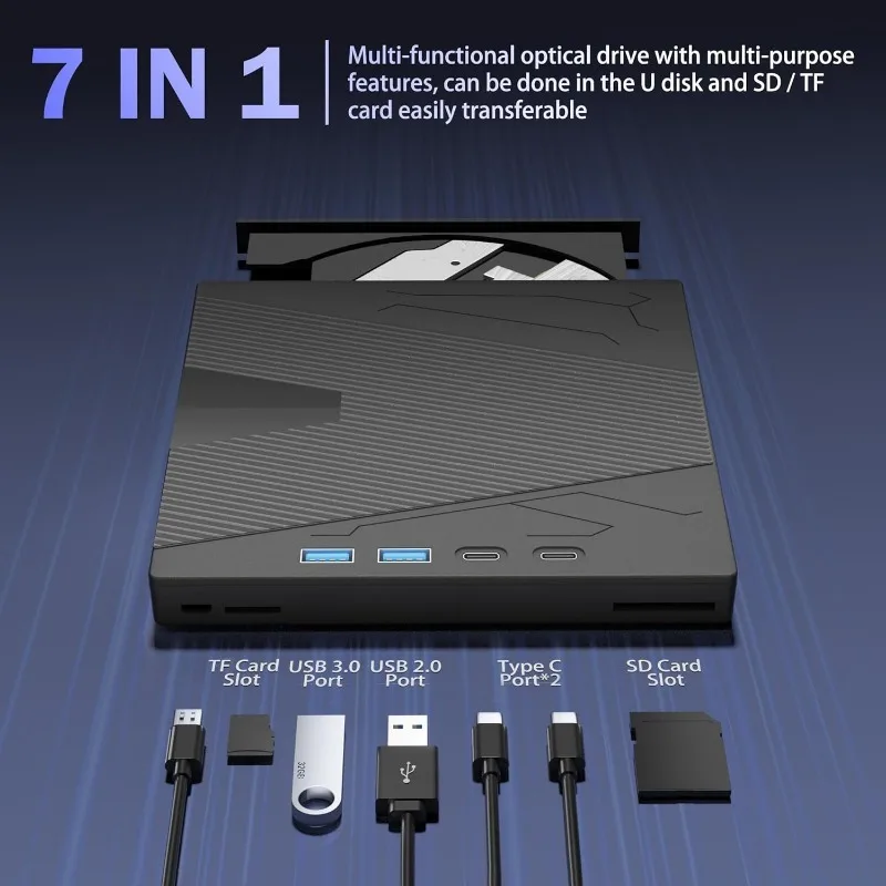 7 IN 1 EXTERNAL DVD DRIVE - Our external CD/DVD drive for laptop contains 7 ports, 1*SD card slot, 1*TF card slot, 2*Type-C ports, 1*USB 3.0 port, 1*USB 2.0 port and a power port, you can also use it as an adapter. (Note that SD card and TF card can't be used at the same time.)